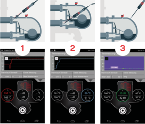 Intuitive Prüfung mit der SteamExpert App: 1. Innentemperatur messen, 2. Außentemperatur messen, 3. Ultraschallsignal messen