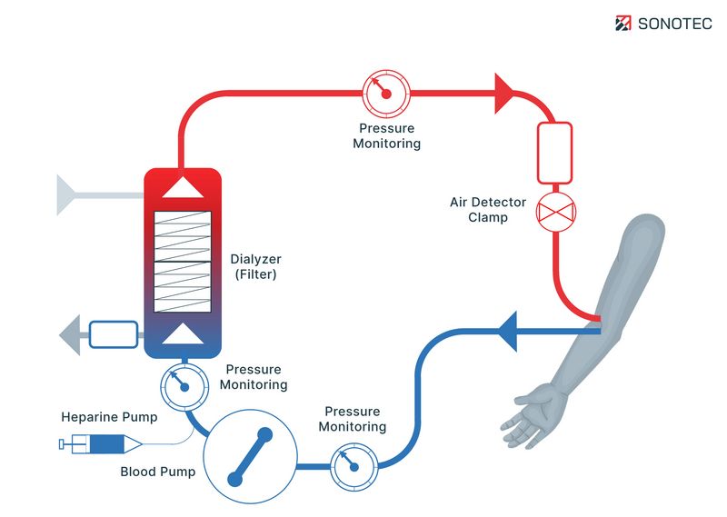 Hemodialysis is an essential and routine medical treatment for which safety has become a clinical priority. Therefore the process requires a chain of interventions to ensure maximum patient safety. Dialysis machines combine a variety of sensors for the monitoring of pressure, flow and liquid level as well as for detecting leaks and air in the tubing system.