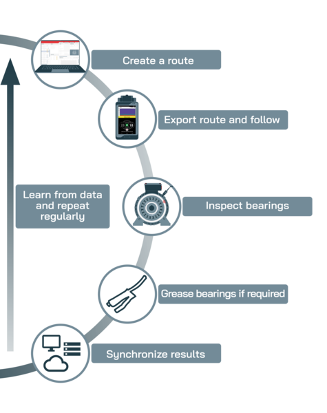 - Grease the bearings as needed according to the information provided by the app and document the results. Immediate status feedback through a traffic light system makes it easy to know if and how much grease needs to be applied to the bearing.